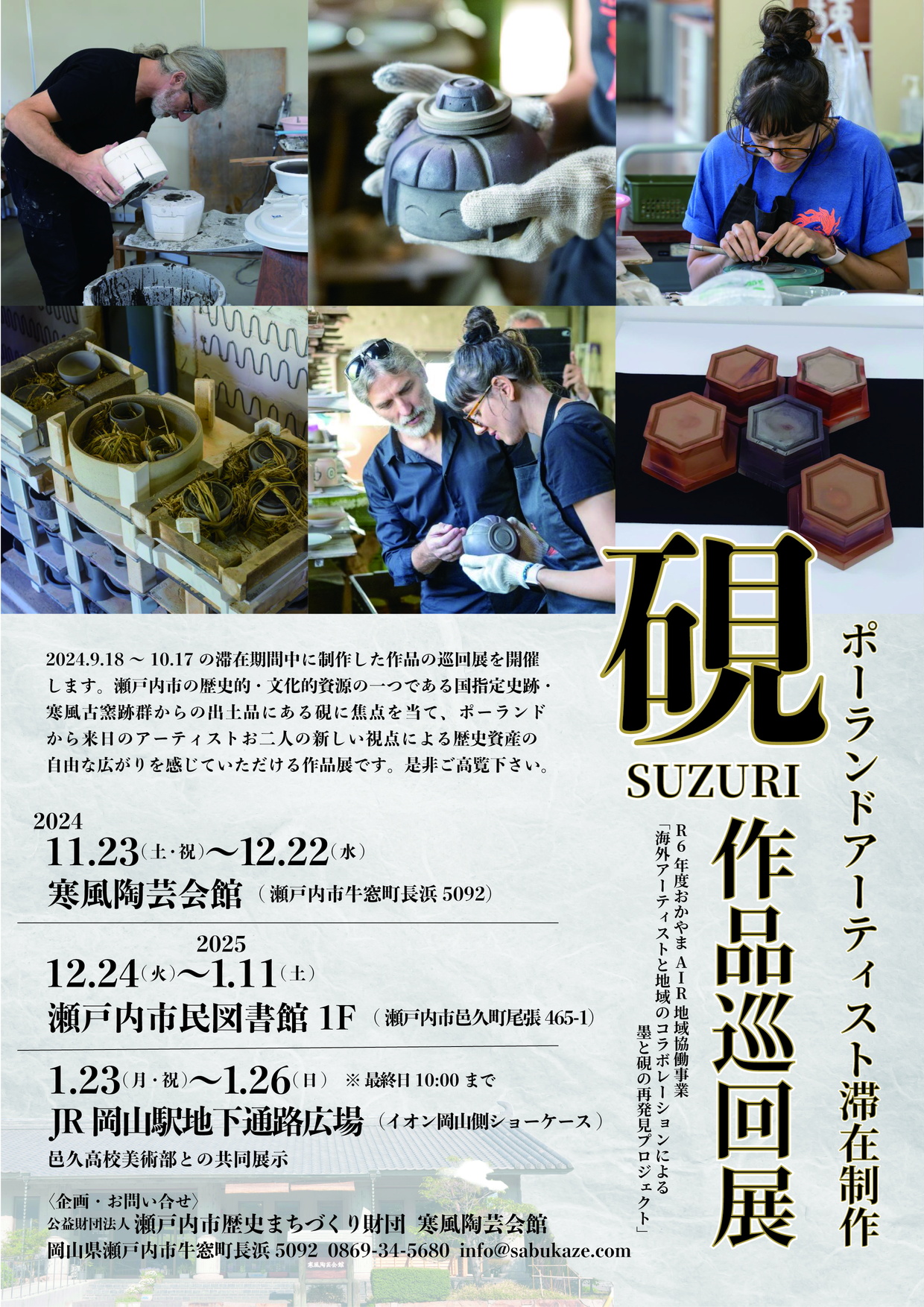 2024.9.18~10/17の滞在期間中に制作した作品の巡回展を開催します。瀬戸内市の歴史的・文化的資源の一つである国指定史跡・寒風古窯跡群からの出土品にある硯に焦点を当て、ポーランドから来日のアーティストお二人の新しい視点による歴史資産の自由な広がりを感じていただける作品展です。 是非ご高覧下さい。