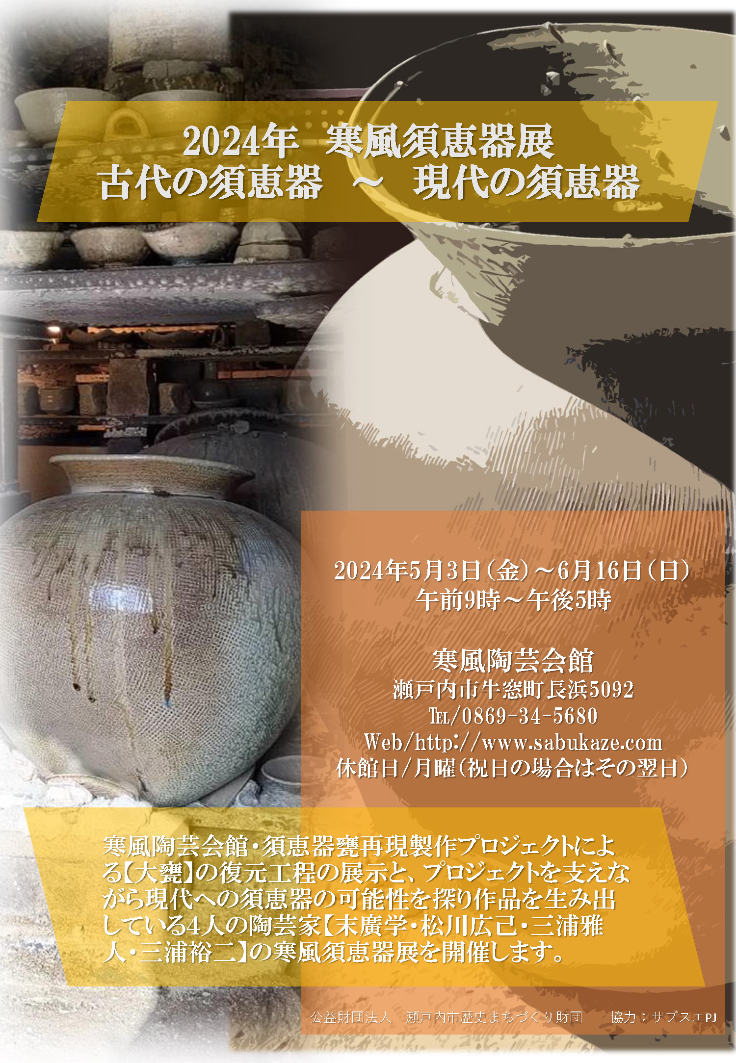 寒風陶芸会館・須恵器甕再現製作プロジェクトによ る【大甕】の復元工程の展示と、プロジェクトを支えな がら現代への須恵器の可能性を探り作品を生み出 している4人の陶芸家【末廣学・松川広己・三浦雅 人・三浦裕二】の寒風須恵器展を開催します。