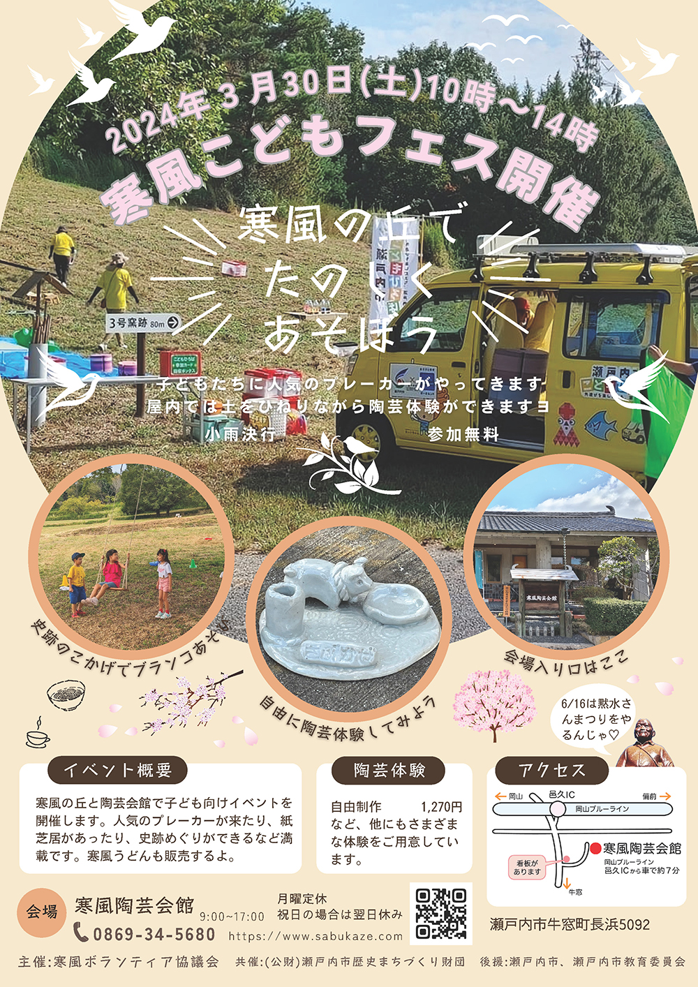 寒風の丘と寒風陶芸会館で子ども向けイベントを開催します。館内では陶芸体験(1,270円~)もできます。寒風うどんの販売もあるよ。