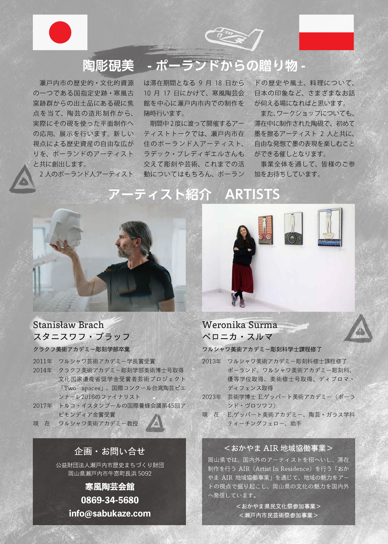2 人のポーランド人アーティストは滞在期間となる 9 月 18 日から 10 月 17 日にかけて、寒風陶芸会館を中心に瀬戸内市内での制作を随時行います。期間中2 度に渡って開催するアー ティストトークでは、瀬戸内市在住のポーランド人アーティスト、ラデック・プレディギエルさんも交えて彫刻や芸術、これまでの活動についてはもちろん、ポーランドの歴史や風土、料理について、日本の印象など、さまざまなお話 が伺える場になればと思います。
